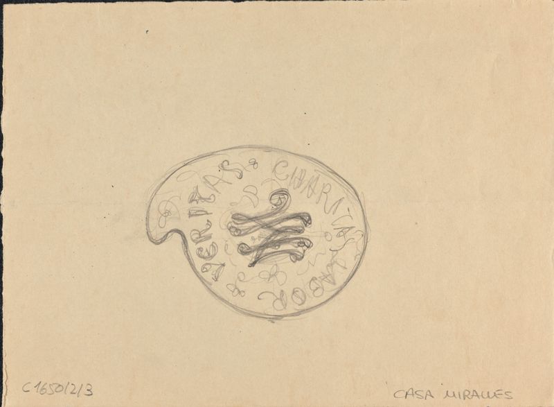 Dibuix de detall decoratiu amb inscripció: veritas, charitas, labor de la Finca Miralles