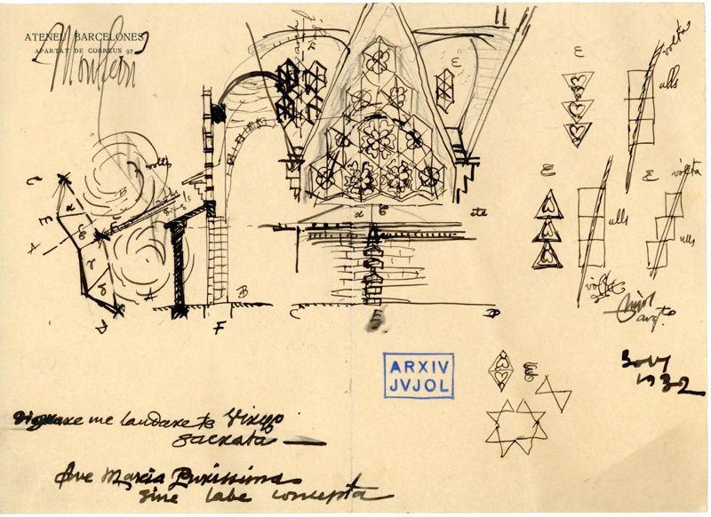 The project was a response to the desire to build a shrine to the Virgin of Montserrat with limited financial, technical and human resources. Jujol decided to use local stone, Portland cement and sand to make prefabricated elements on site that were to serve both for the structure and for the windows. For the arches, walls and vaults, pieces measuring 10 x 15 x 30 centimetres are used, in addition to the filler stones. The windows are made with prefabricated pieces, made on site and designed by Jujol himself, so that, juxtaposed, they form hexagonal figures. The general structure is a set of parabolic arches starting from pillars of minimal section. The general system is based on a triangulated plan that forms a broken perimeter of 24 segments, all of which are unequal. In total they form 42 pillars and, on top of that, 33 turns are reminiscent of the shapes of the mountain of Montserrat.
