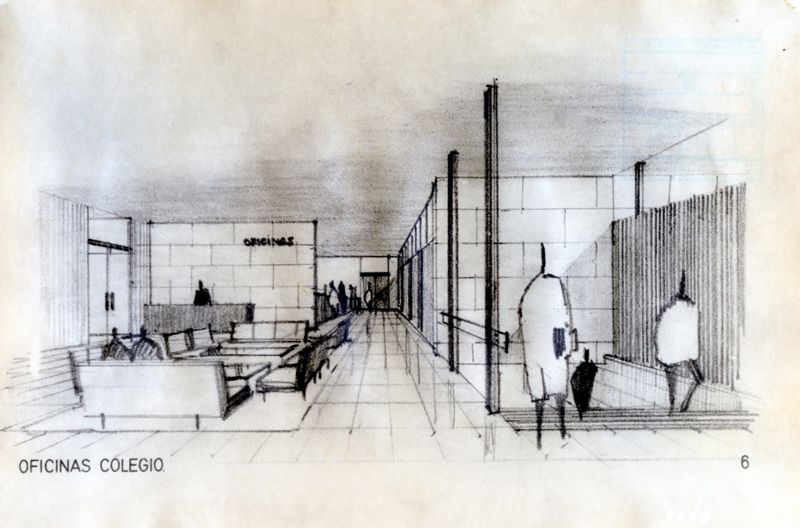 Vista interior del hall d'accés del Col·legi Oficial de Metges de Barcelona.